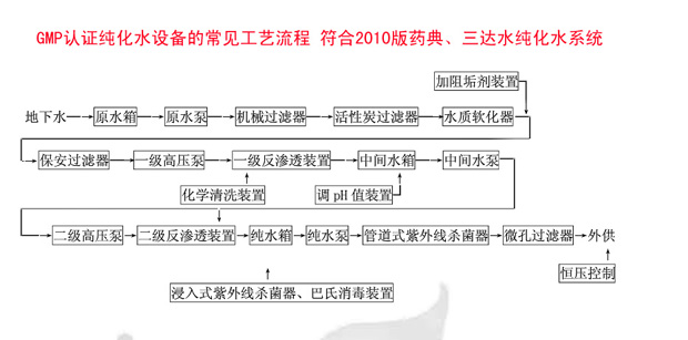 符合新藥典GMP認(rèn)證用純化水設(shè)備系統(tǒng)工藝流程 |